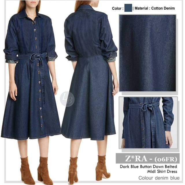 ZARA denim button belted shirt dress  blue belted midi denim dress