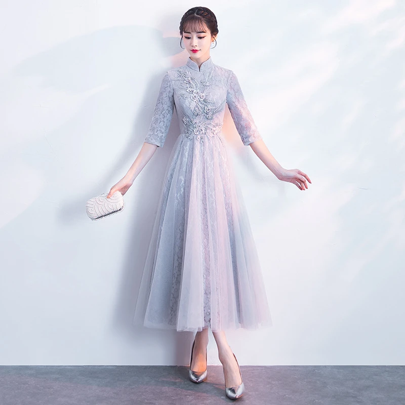 Gray Lace Embroidery Evening Cheongsam chinese collar long gown