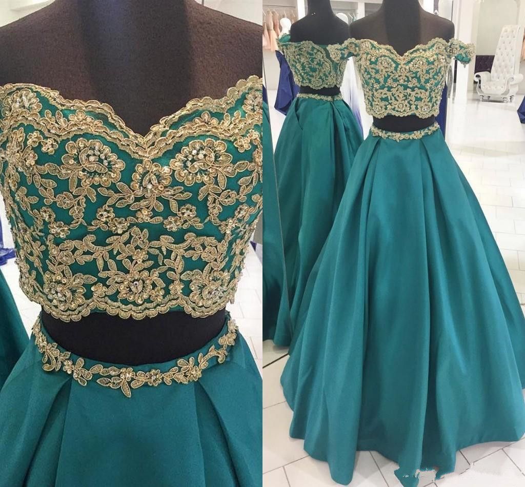 2018 Satin Off Shoulder Gold Lace teal and gold prom dress