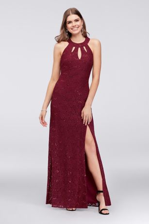 Sequin Lace Halter Sheath Gown with merlot david's bridal
