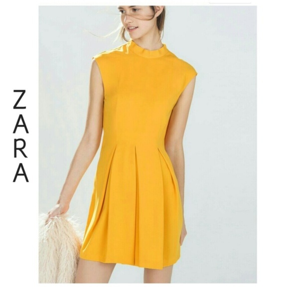 Yellow Pleated Mock Neck Dress Xs yellow mock neck dress