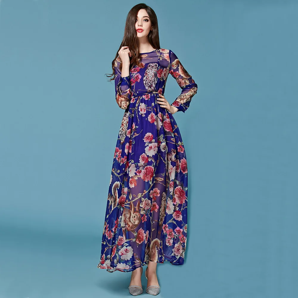 Owl Printed Silk Designer casual gown designs with sleeves