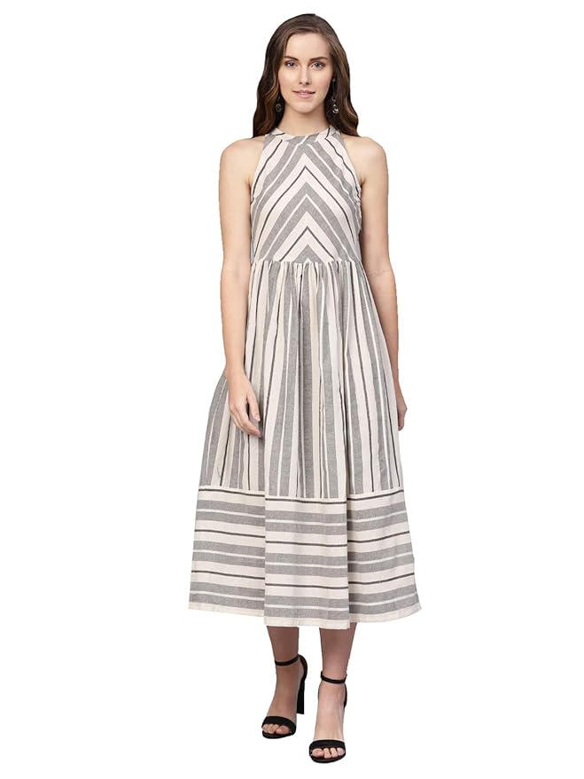 Buy Inddus Off White \u0026 Grey Cotton grey striped midi dress