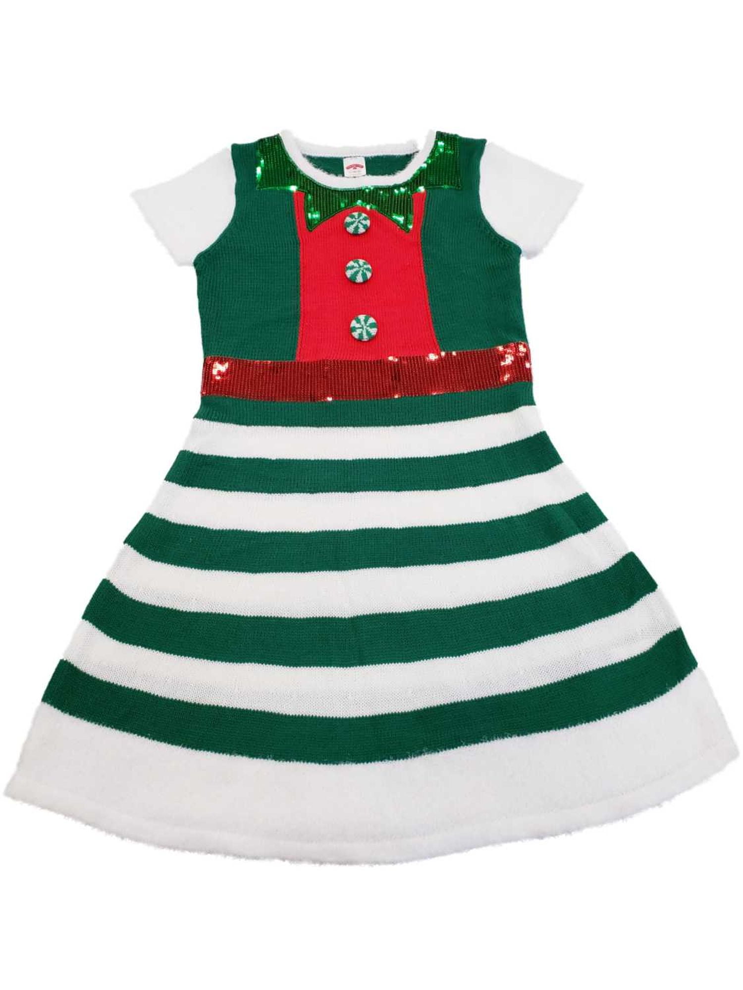 Girls Green Red White Fuzzy Sequin Elf walmart holiday sweater dress