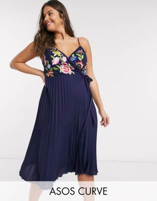 ASOS DESIGN Curve embroidered pleated wrap front pleated cami dress