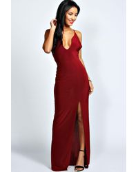 Boohoo Synthetic Sophie Plunge Neck berry layered split front maxi dress