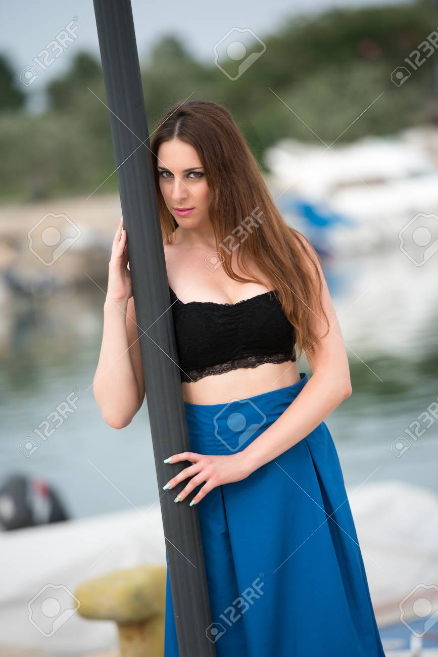 Woman Wear Long Blue Skirt And Black blue skirt and black top