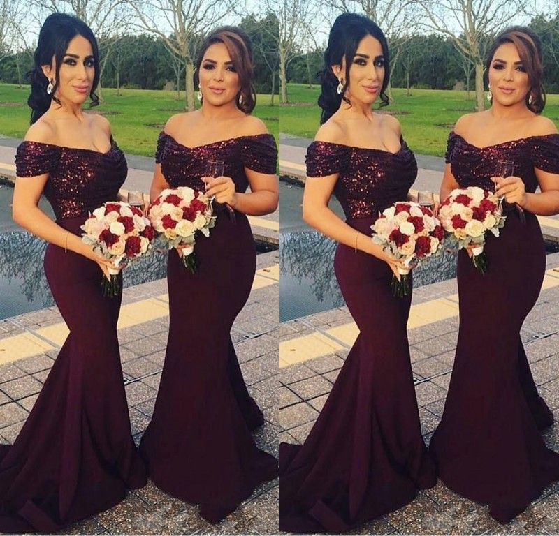 2021 Off Shoulder Sweep Train Burgundy maroon color dress for bridesmaid