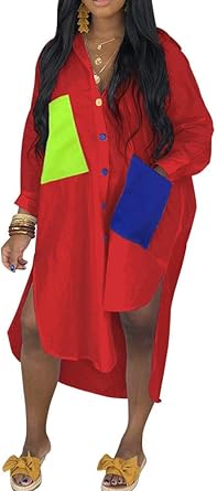 Ladies Womens Belted Button Down Long red button down shirt dress