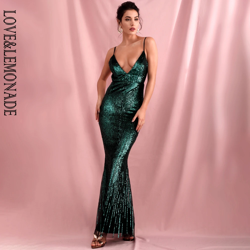 LOVE\u0026LEMONADE Sexy Green Deep V Neck open back fishtail dress