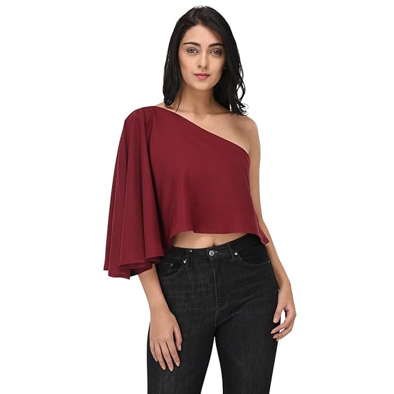 Raaika Womens One Shoulder Maroon Crop party wear crop top with jeans