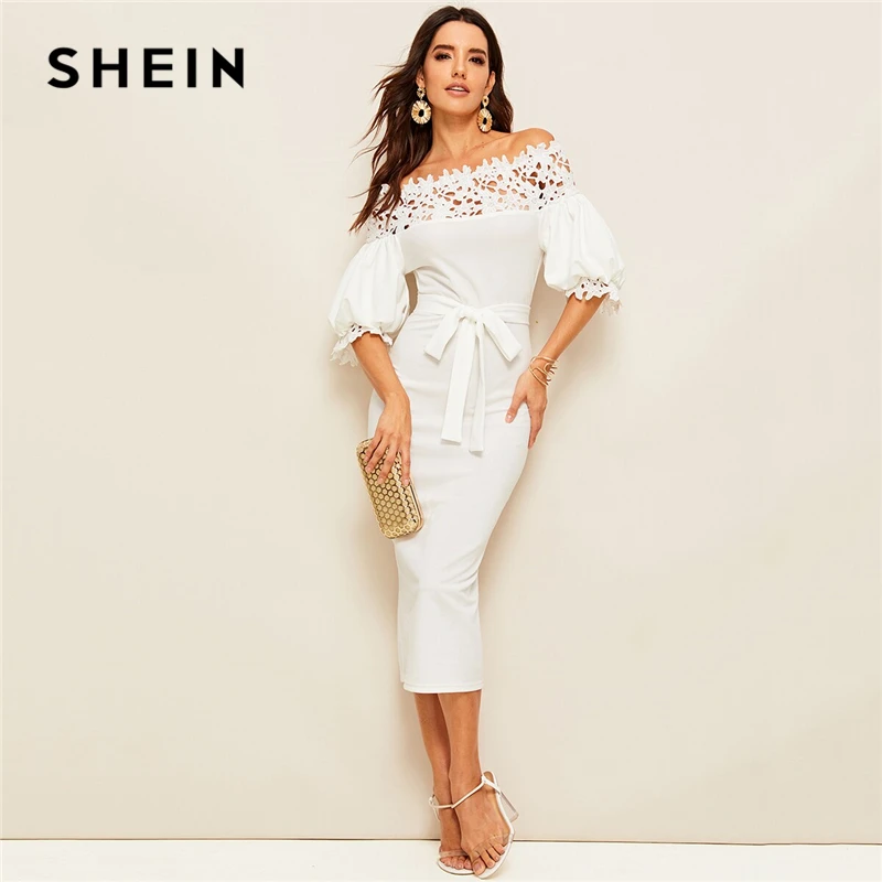 SHEIN Guipure Lace Yoke Bishop Sleeve off white pencil dress