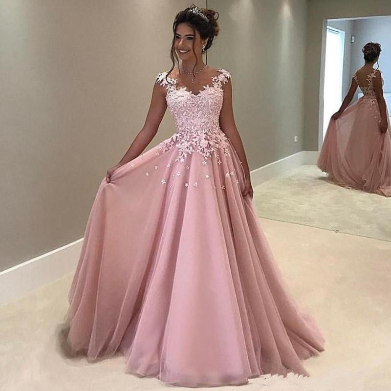 2018 Vintage Blush Pink Jewel Prom flowy blush pink dress