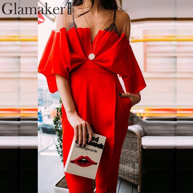 Glamaker Sexy pleated patchwork mesh red jumpsuit bodycon