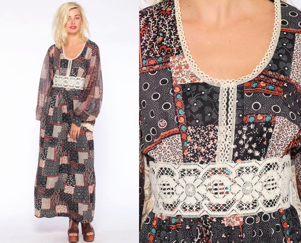 Long Patchwork Dress 70s Maxi Dress balloon sleeves boho printed maxi dresses