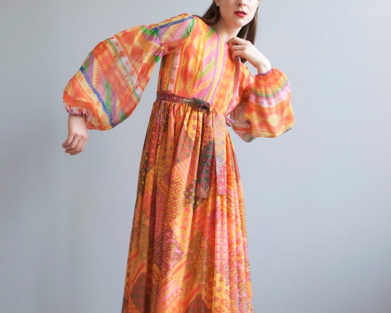 Orange chiffon maxi dress with balloon balloon sleeves boho printed maxi dresses