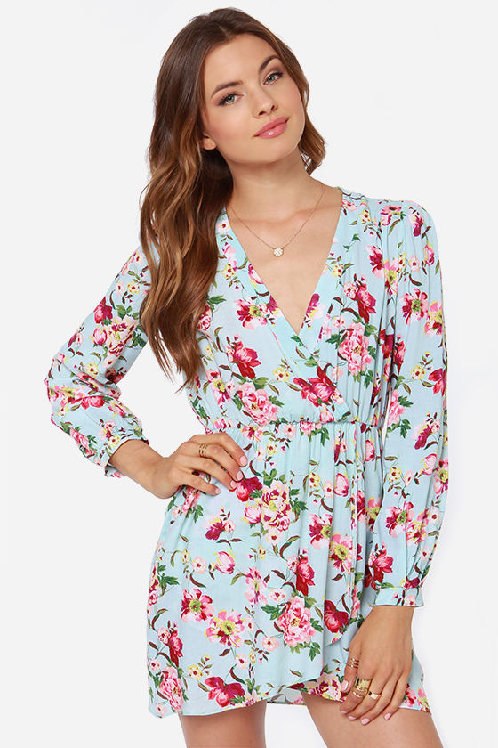 Cute Blue Dress - Floral Print Dress blue floral long sleeve wrap dress